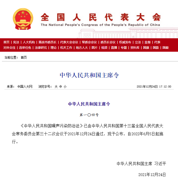 2021年12月24日,全國人大常委會會議表決通過了《中華人民共和國噪聲污染防治法》,將于2022年6月5日起施行。現行《中華人民共和國環境噪聲污染防治法》于1996年制定、1997年3月頒布實施。時隔20多年后,新法進行了較大范圍的修改。與現行噪聲法相比,新噪聲法主要有以下幾方面的變化:
