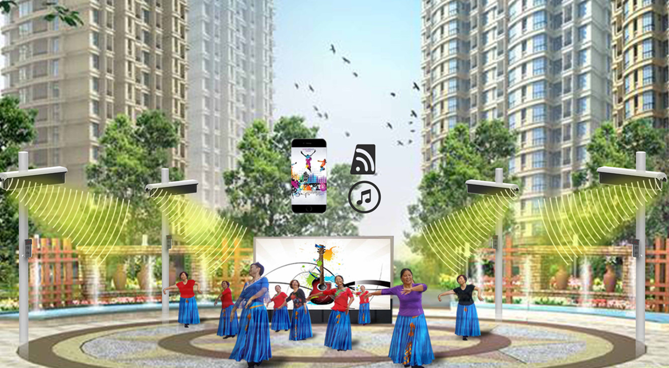 智慧廣場舞系統針對廣場舞市場的需求,首先在擾民問題上做出了根治方案。根據定向聲原理,保證系統播放聲音覆蓋整個舞隊,確保舞隊內每一個成員都能聽清舞曲,跟上節奏。同一個場地上部署多個系統時,通過技術人員調試,確保每個舞隊的音樂聲音互不干擾。聲音傳播變得靈活可控,居民區自然不再受到噪音攻擊。