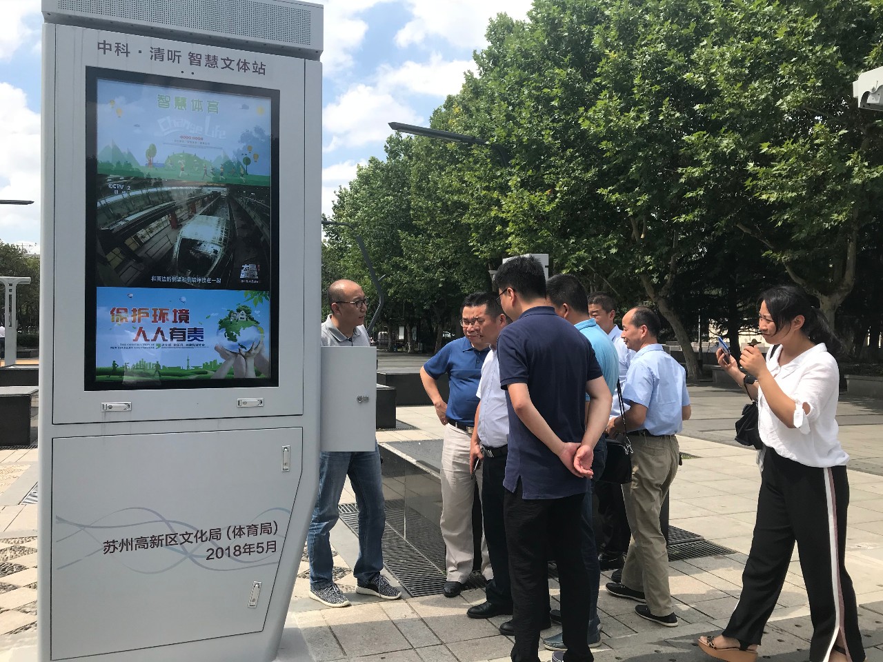◆2018年6月23日,銅陵市銅官區(qū)區(qū)委常委楊友進、區(qū)政府副區(qū)長巫永生、國家獅子山高新區(qū)黨工委書記王基宏、區(qū)委宣傳部常務副部長高鵬、區(qū)招商局長余建國、區(qū)商務局長查日春等一行前往蘇州高新區(qū)馨泰花苑智慧廣場舞示范點,就智慧體育便民設施進行考察。